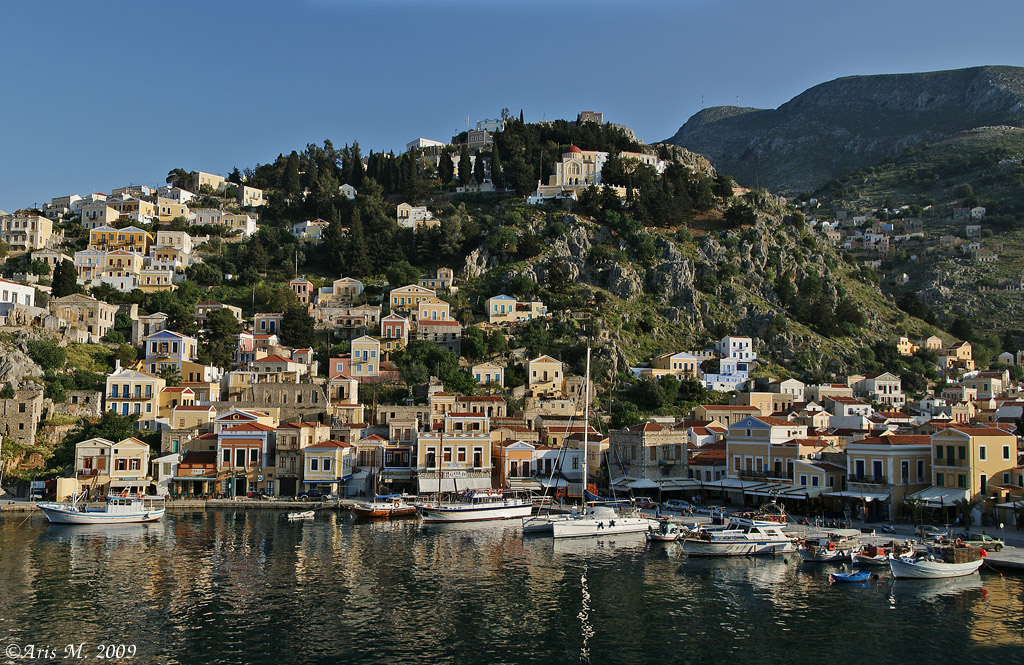 SYMI, the capital and main harbor of the island, is built at the head of a sheltered bay, with characteristic two-storey houses spreading on the hills around the harbor.